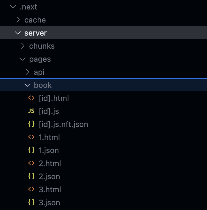 build ํ ๋ง๋ค์ด์ง .next/server/pages/book ๋ณด๋ฉด path๋ฅผ ์ง์ ํด๋์ ํ์ด์ง๋ค์ html ํ์ผ์ด ์๋ ๊ฒ์ ๋ณผ ์ ์๋ค.