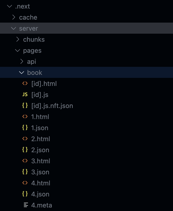 build ํ ๋ง๋ค์ด์ง .next/server/pages/book ๋ณด๋ฉด path๋ฅผ ์ง์ ํด๋์ ํ์ด์ง๋ค์ html ํ์ผ์ด ์๋ ๊ฒ์ ๋ณผ ์ ์๋ค.