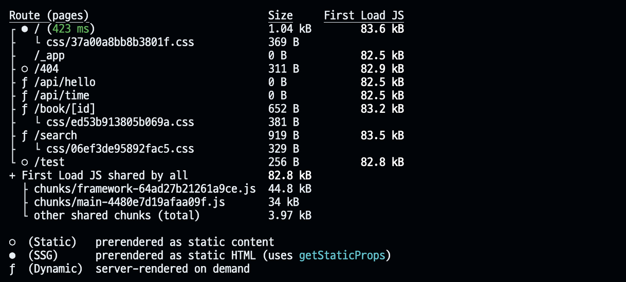Route์์ ๋ณด์ฌ์ง๋ ๊ธฐํธ๋ค์ ํตํด SSG ํ์ด์ง์ธ์ง Dynamic ํ์ด์ง(SSR)์ธ์ง ๋๋ Static ํ์ด์ง์ธ์ง ์ ์ ์๋ค.