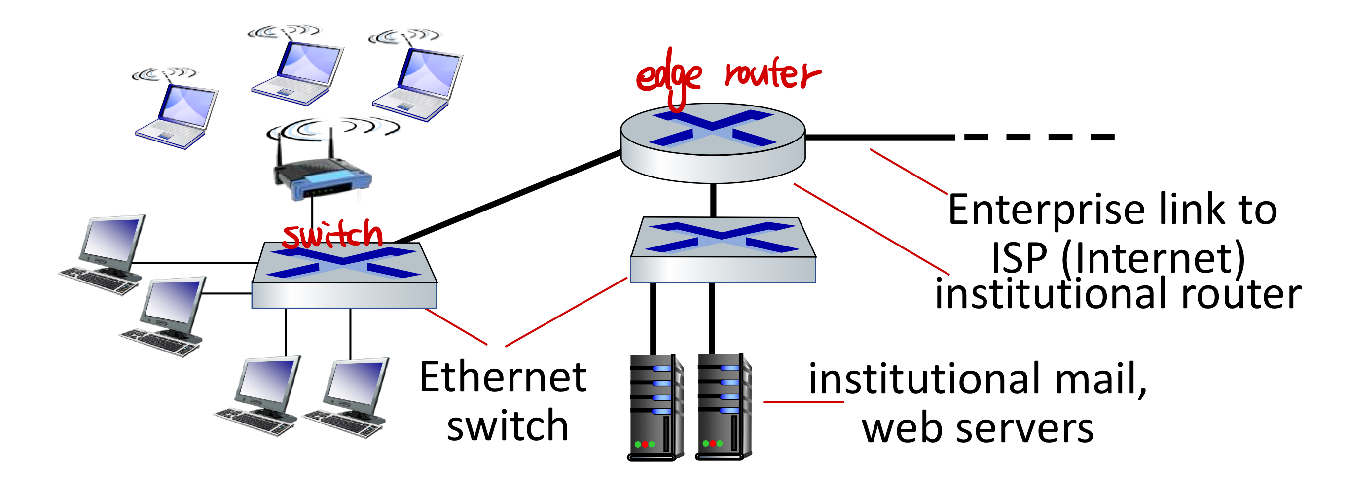 - Wide-area cellular access networks == ๊ธฐ์ง๊ตญ(Base station, LTE/5G๋ฑ์ ์์ธ์ค ๋คํธ์ํฌ์ ํด๋์ ํ๋ฅผ ์ฐ๊ฒฐ)