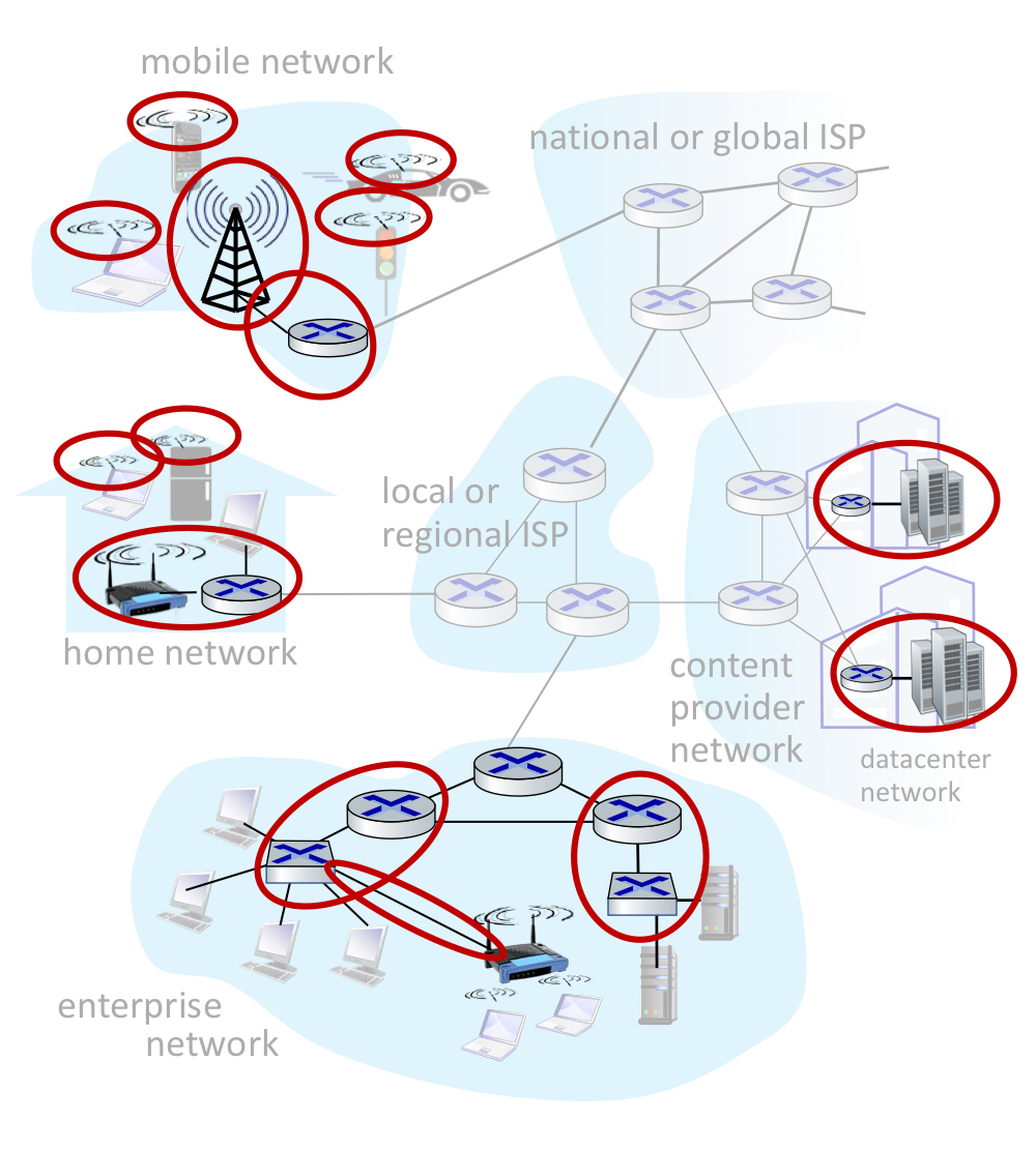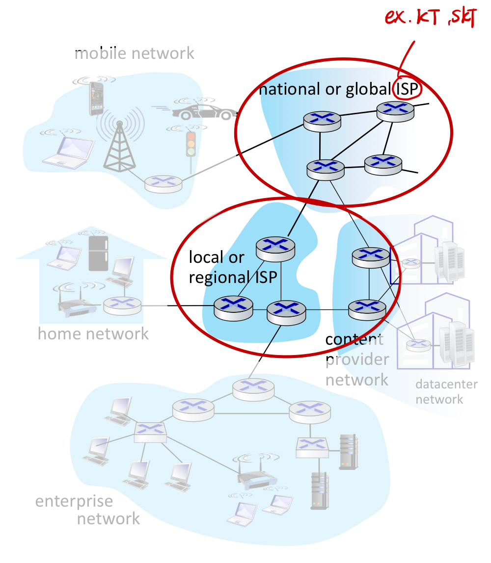 3. ๋คํธ์ํฌ ์ฝ์ด๋ ์ ์ฒด ๋คํธ์ํฌ ์์คํ ์ ์ค์์ ์์นํ์ฌ ๋ฐ์ดํฐ๋ฅผ ์ ์กํ๋ ํต์ฌ์ ์ธ ์ญํ ์ ํ๋ค. ๋คํธ์ํฌ ์ฝ์ด๋ ์๋ง์ router๋ค์ด ๊ทธ๋ฌผ์ฒ๋ผ ์ฝํ์๋ ๊ตฌ์กฐ๋ฅผ ๋ค๋ค. ์ด๋ ISP๋ ์๋ก ์ํธ ์ฐ๊ฒฐ๋์ด ์๋๋ฐ ์ด๋ฅผ network of networks ํํ๋ผ๊ณ ํ๋ค.
