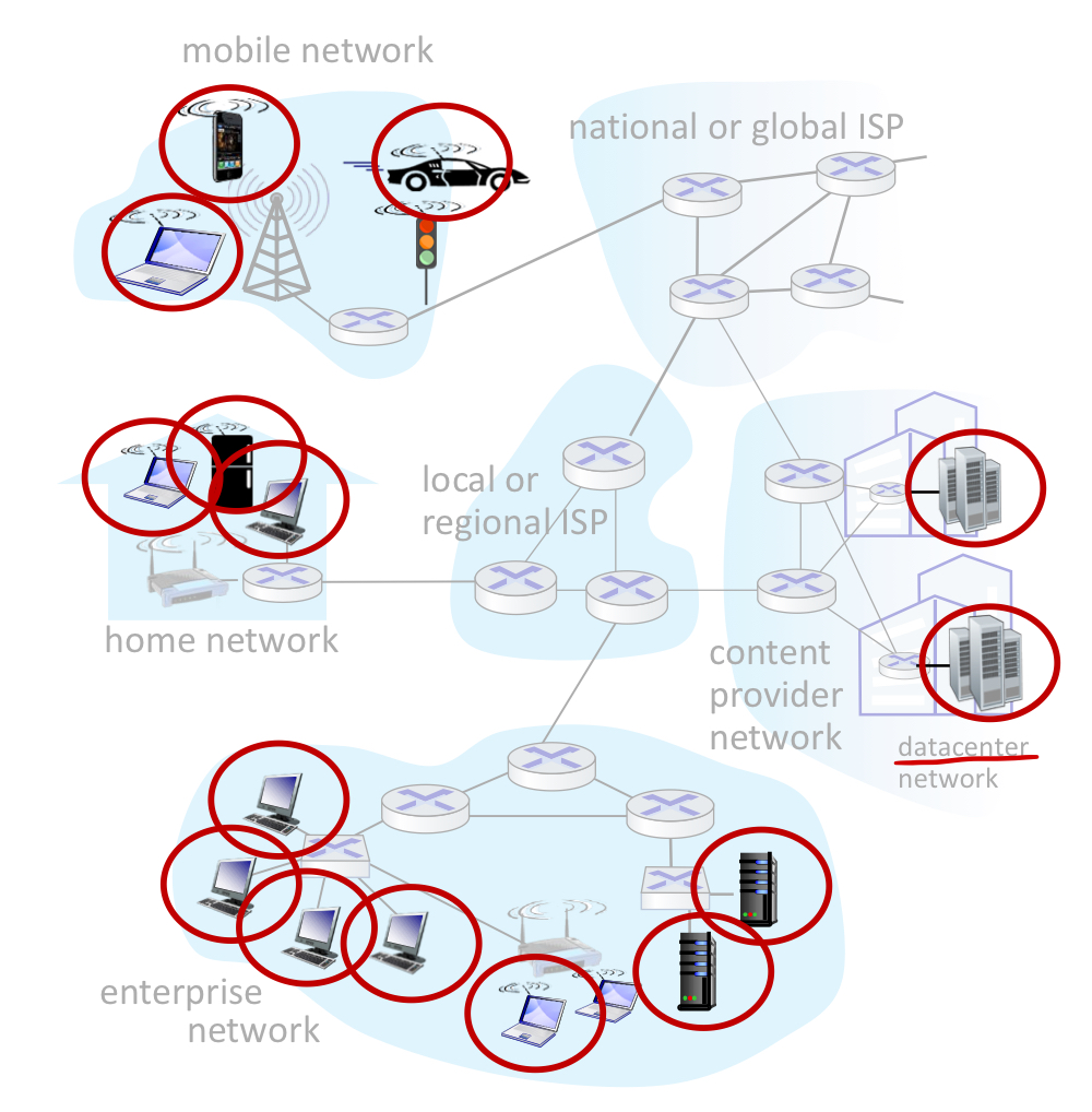 1. ๋คํธ์ํฌ ์ฃ์ง๋ ์ธํฐ๋ท์ ๊ฐ์ฅ์๋ฆฌ์ด๋ค. ์ฌ๊ธฐ์๋ ์๋ง์ end systems์ด ์กด์ฌํ๋ค. End system์ host์ด๋ค. host๋ ํด๋ผ์ด์ธํธ๋ ์๋ฒ๋ฅผ ๋ปํ๋ค. ์๋ฒ๋ data senter์ ์๋ ์๋ฒ๋ก ์๊ฐํ๋ฉด ๋๋ค.