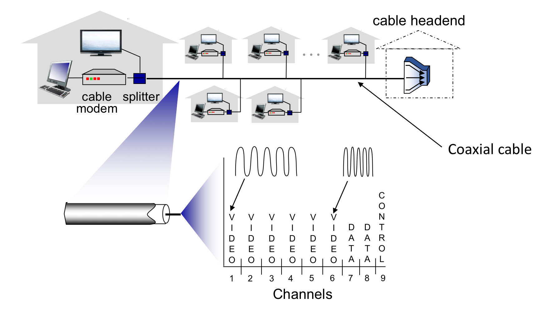 Cable network์ ํน์ง์ ํ ๋ผ์ธ์ ์ฌ๋ฌ ์ง์ cable๋ค์ด ๋์์ ์ฐ๊ฒฐ๋ ํํ๋ผ๋ ๊ฒ์ด๋ค. ์ฆ ํ ์ง ๋ฟ๋ง ์๋๋ผ ์ฌ๋ฌ ์ง์ด ๊ณต์ ๋ฅผ ํ๋ค๋ ๊ฒ์ด๋ค. ํ์ง๋ง ๋ค์ํ ์ฌ์ฉ์๋ค์ ๋ฐ์ดํฐ๊ฐ ํ ๋ผ์ธ์ ๋ชจ๋ ์๋ ๊ฒ์ ์๋๊นํ๋ ๊ฑฑ์ ์ด ๋ค ์ ์๋ค. ํ์ง๋ง ์ด๋ฌํ ๋ฐ์ดํฐ๋ค์ ๊ตฌ๋ถํ ์ ์๋ ๋ฐฉ๋ฒ์ด ์๋ค. ๋ฐ๋ก ๊ฐ๊ฐ ๋ค๋ฅธ ์ฃผํ์๋ก ์ค์ด์ ๋ฐ์ดํฐ๋ฅผ ๋๋ฅด๋ ๊ฒ์ด๋ค. ์ ์ฒด ์ฃผํ์ ๋ฐด๋๊ฐ ์๋ค๋ฉด ๊ทธ๊ฒ์ ์ธ๋ถ ์กฐ๊ฐ์ผ๋ก ์ชผ๊ฐ์ ๊ฐ๊ฐ ์ง์ ๋ฐ์ดํฐ๋ฅผ ๋ค๋ฅธ ์ฃผํ์๋ก ์ค์ด์ ๋๋ฅด๋ ๊ฒ์ด๋ค. ์ด๋ฌํ ๋ฐฉ์์ FDM(frequency division multiplexing)์ด๋ผ๊ณ ๋ถ๋ฅธ๋ค.