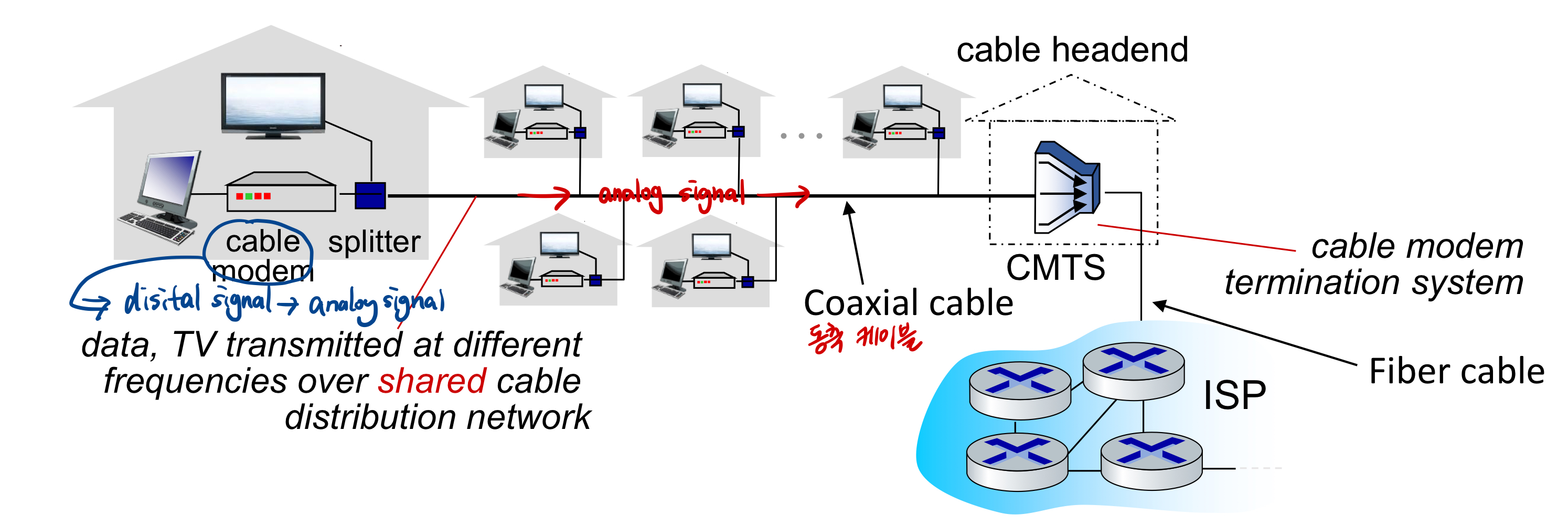 Cable network๋ ํ ๋ ๋น์ ์ด ์ฐ๊ฒฐ๋์ด ์์ผ๋ฉฐ ์ปดํจํฐ์๋ cable modem์ด ์ด๊ฒฐ๋์ด ์๋ค. cable model์ disital ์ ํธ๋ฅผ ์๋ ๋ก๊ทธ ์ ํธ๋ก ๋ฐ๊พธ์ด์ฃผ๋ ์ญํ ์ ํ๋ค. Cable network์์๋ ์ฃผ๋ก Coaxial cable(๋์ถ ์ผ์ด๋ธ)์ ์ฌ์ฉํ๋ค.