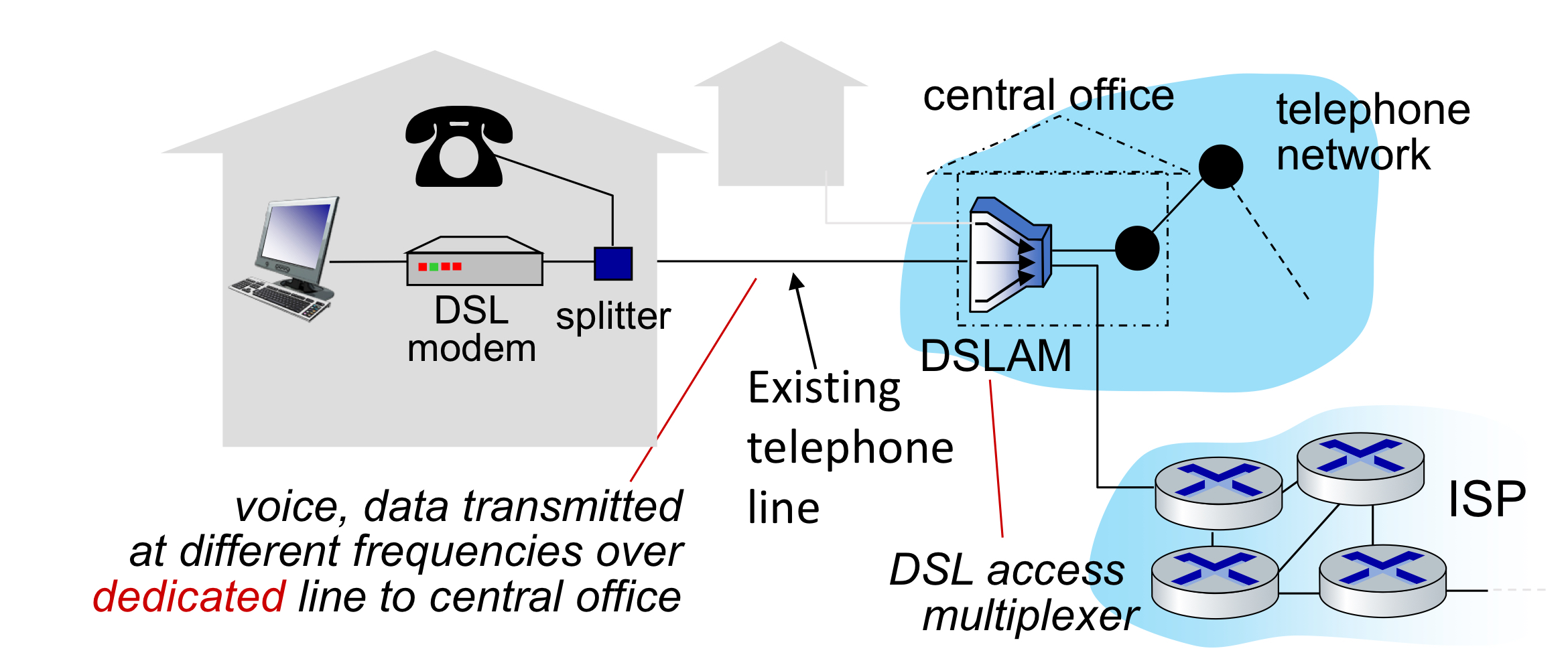 DSL์์๋ ์ด๋ฏธ ์กด์ฌํ๋ ์ ํ์ (existing telephone line)์ ์ฌ์ฉํด์ ์ธํฐ๋ท์ ๋ฐ์ดํฐ๋ฅผ ์ค์ด๋๋ฅด๋ ๋ฐ ์ฌ์ฉํ๋ ๊ฒ์ด๋ค.