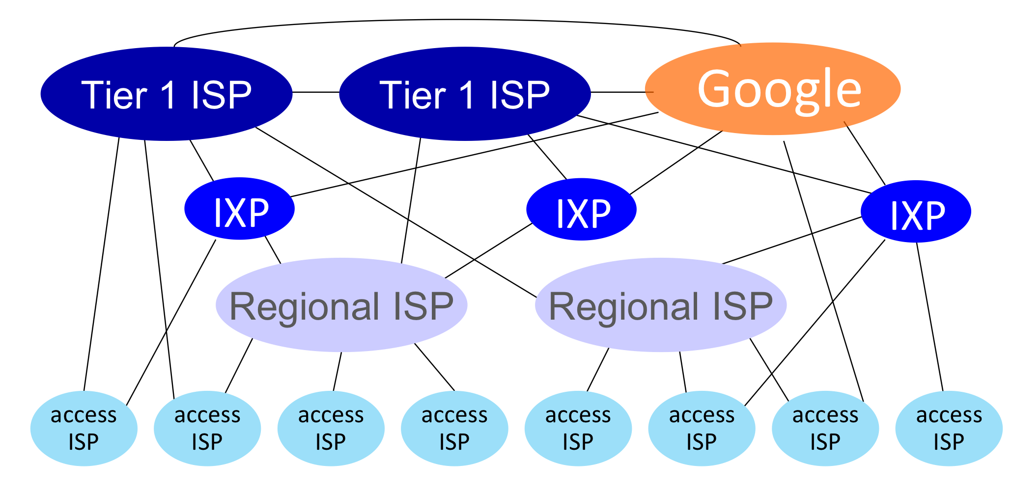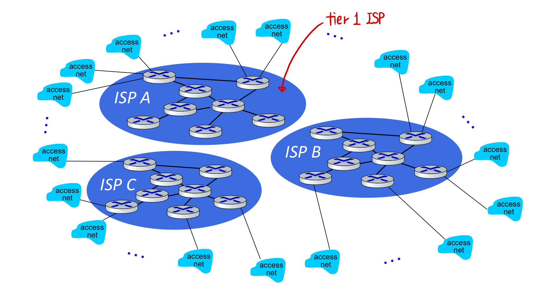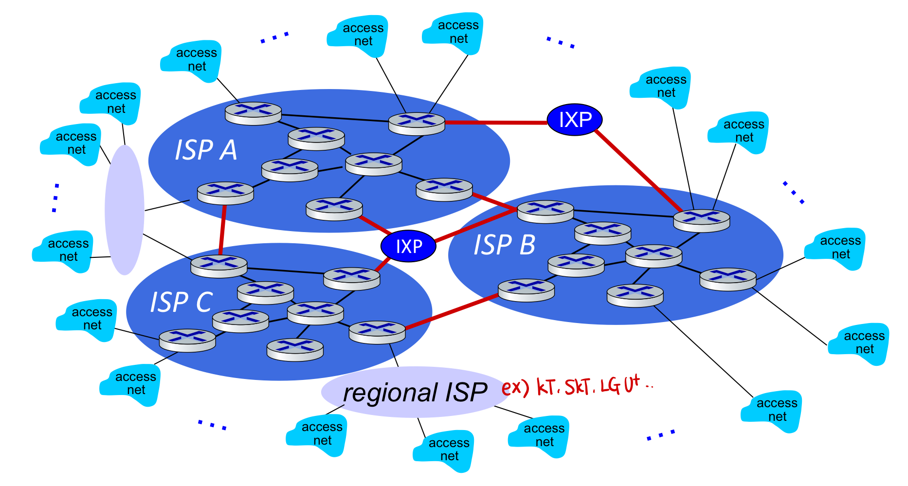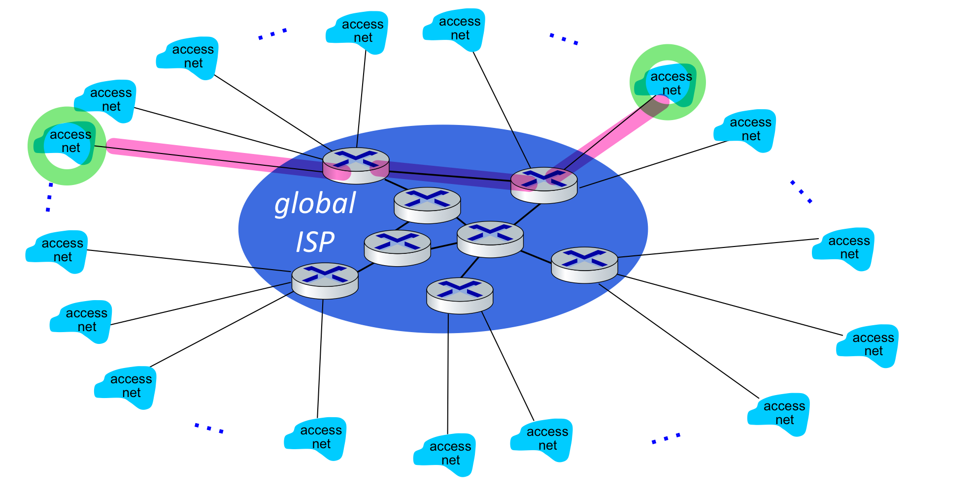 ๊ฐ access ISP๊ฐ ์๋ก ์ฐ๊ฒฐ๋๋ ๊ฒ์ ๊ฑฐ์ ๋ถ๊ฐ๋ฅํ๋ค. ๋ฐ๋ผ์ global ISP๊ฐ ํ์ํ๋ค.