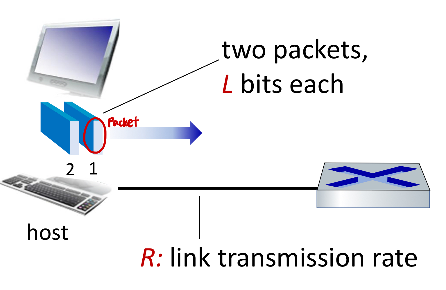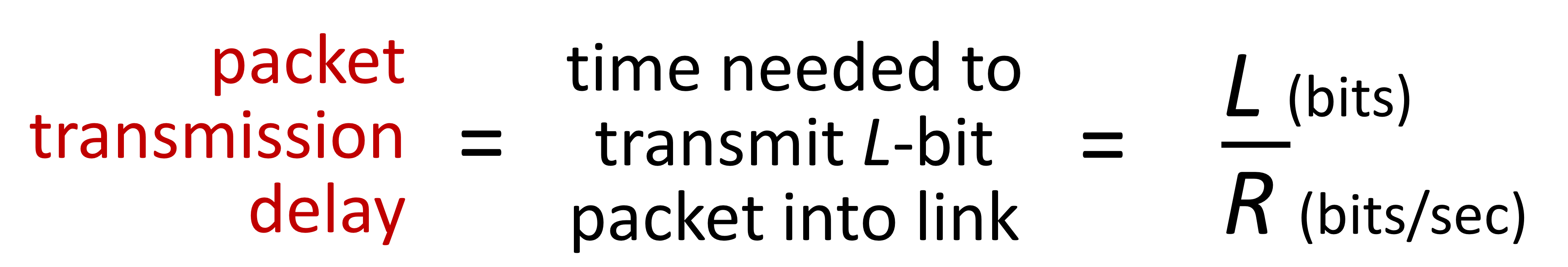 - Transmission delay : takes L/R seconds to transmit(push out) L-bit packet into link at R bps