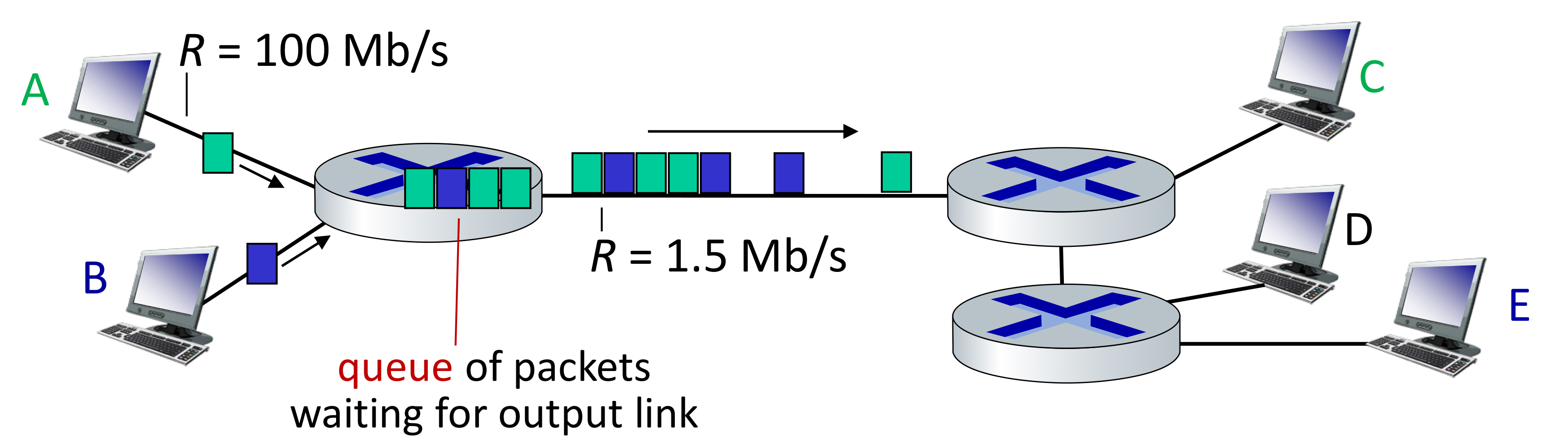 ํ์ง๋ง ์์ฒ๋ผ ๋ผ์ฐํฐ๋ฅผ ์ฌ์ด์ ๋ ๋ ๋งํฌ๊ฐ ๋ชจ๋ ๊ฐ์ ์๋์ด๋ฉด ์ข๊ฒ ์ง๋ง, ๋๋ถ๋ถ์ ๊ทธ๋ ์ง ์๋ค.- Packet queueing and loss : if arrival rate(in bps) to link exceeds transmission rate(bps) of link for a period of time(๋งํฌ์ ๋ํ ๋์ฐฉ ์๋๊ฐ ์ผ์ ๊ธฐ๊ฐ ๋์ ๋งํฌ์ ์ ์ก ์๋๋ฅผ ์ด๊ณผํ๋ ๊ฒฝ์ฐ)