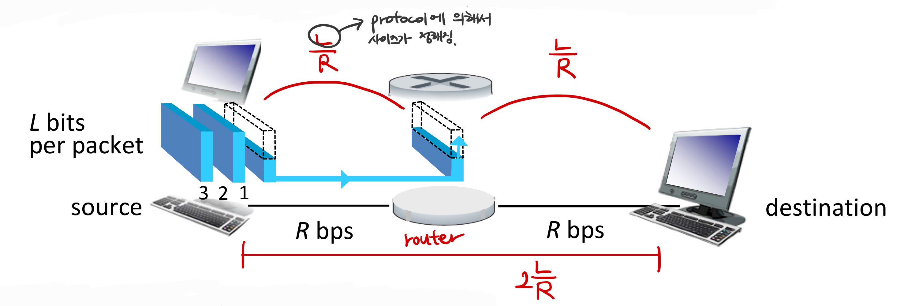 ์ ์ฒด ํจํท(ํ ํจํท์ ์ ์ฒด bits)์ด ๋ค์ ๋งํฌ์์ ์ ์ก๋๊ธฐ ์ ์ ๋ผ์ฐํฐ์ ๋ชจ๋ ๋์ฐฉํด์ผ ํ๋ค. - End-end delay : 2L/R, assuming zero propagation delay(more on delay shortly)