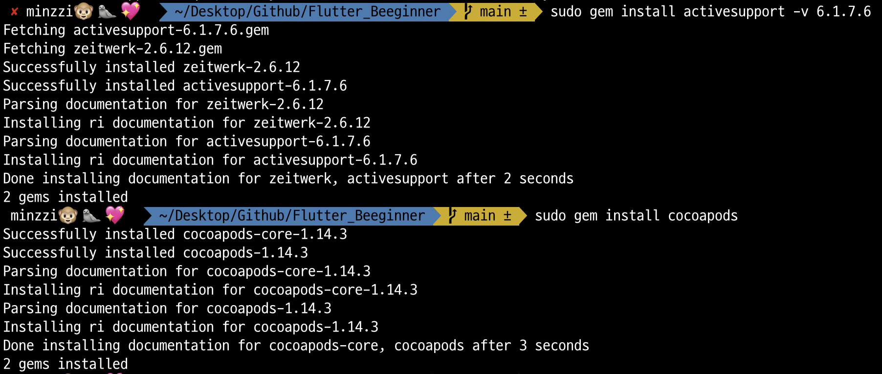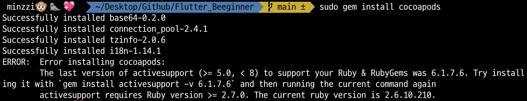 ๊ทธ๋ฌ๊ณ ๋ค์ cocoapods์ ์ค์นํด์คฌ๋๋ฐ ๋ ์ค๋ฅ๊ฐ ๋์ค๋ฉด์ activesupport๋ฅผ ์ค์นํ๋ผ๊ณ ํ๋ค.