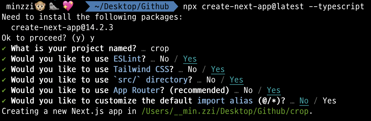 ๋ง์ฝ typescript๋ฅผ ์ฌ์ฉํ๊ณ ์ถ๋ค๋ฉด ์๋์ ๊ฐ์ด --typescript๋ฅผ ๋ถ์ฌ์ฃผ๋ฉด ๋๋ค.