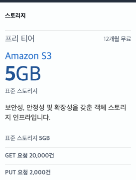 12๊ฐ์ ๋์ 5GB ์ ๊ณต, GET ์์ฒญ 20000๊ฑด, PUT ์์ฒญ 2000๊ฑด
