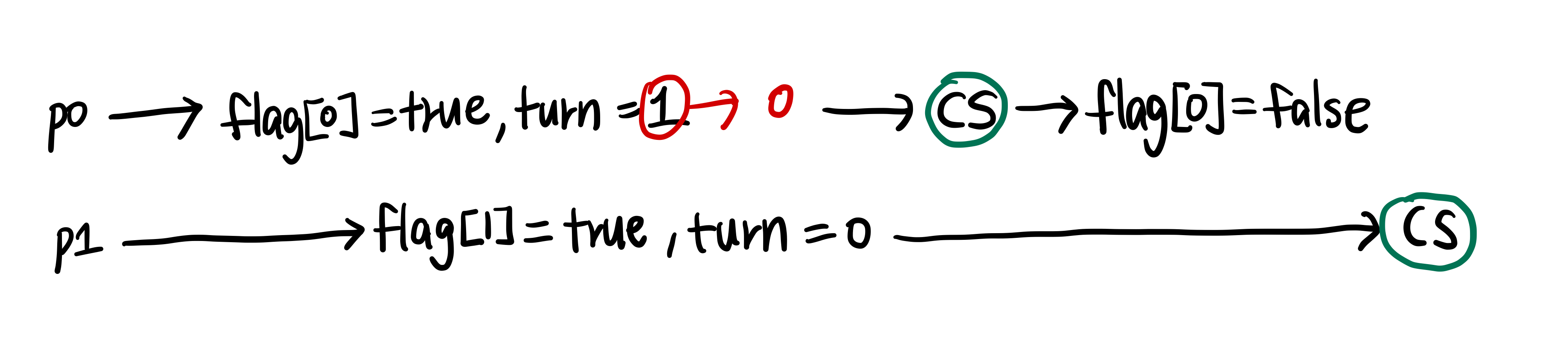 - boolean falg[2]; // ๊ฐ ํ๋ก์ธ์๊ฐ critical section์ผ๋ก ์ง์ ํ ์ค๋น๊ฐ ๋์๋ค๋ ๊ฒ์ ํํํ ๋ฐฐ์ด