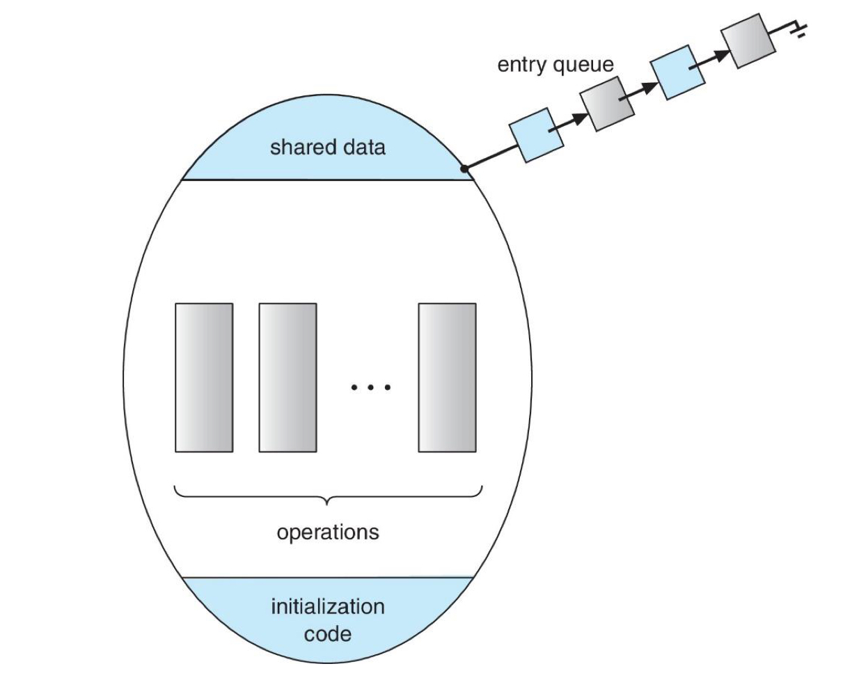 ๊ฐ ๋ชจ๋ํฐ๋ง๋ค mutex๋ผ๋ binary semaphore๊ฐ ์ ์๋๊ณ ๊ทธ ์ด๊ธฐ ๊ฐ์ 1์ด๋ค. ํ๋ก์ธ์ค๋ ๋ชจ๋ํฐ๋ก ๋ค์ด๊ฐ๊ธฐ ์ ์ wait(mutex)๋ฅผ ์คํํ๊ณ ๋ชจ๋ํฐ๋ฅผ ๋์จ ํ์ signal(mutex)์ ์คํํด์ผ ํ๋ค.