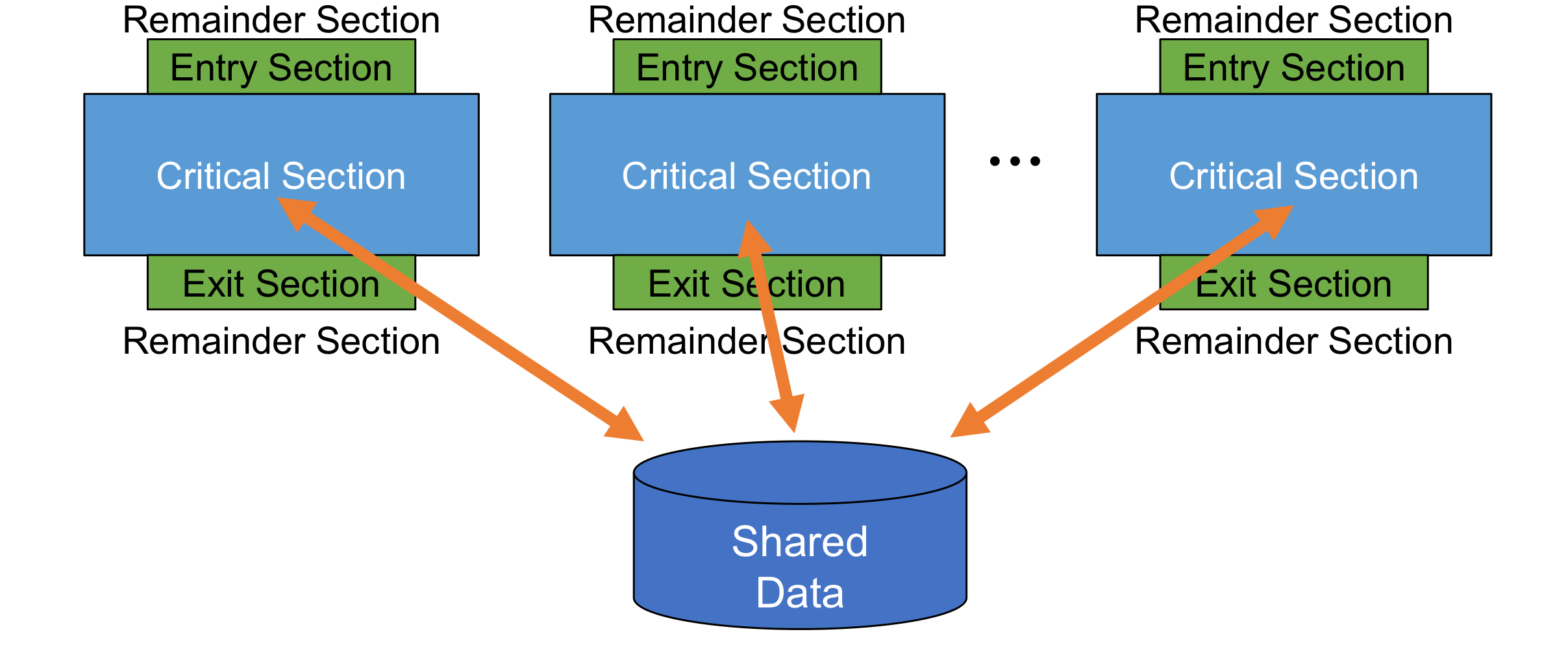 ๊ฐ ํ๋ก์ธ์ค๋ ์์ ์ critical section์ผ๋ก ์ง์ ํ๋ ค๋ฉด entry section์์ ์ง์ ํ๊ฐ๋ฅผ ์์ฒญํด์ผ ํ๊ณ , critical section ๋ค์๋ exit section์ด ๋ฐ๋ผ์ฌ ์ ์๋ค. ์ฝ๋์ ๋๋จธ์ง ๋ถ๋ถ๋ค์ ์ด์นญํ์ฌ remainder section์ด๋ผ๊ณ ํ๋ค.