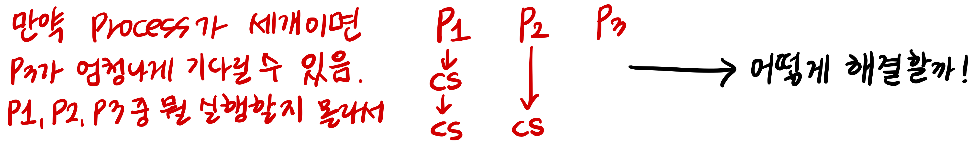 - Bounded Waiting(ํ์ ๋๊ธฐ) : critical section์ ์ง์ ํ๋ ค๋ process๊ฐ ๋ฌดํํ๊ฒ ๋๊ธฐํด์๋ ์๋๋ค.